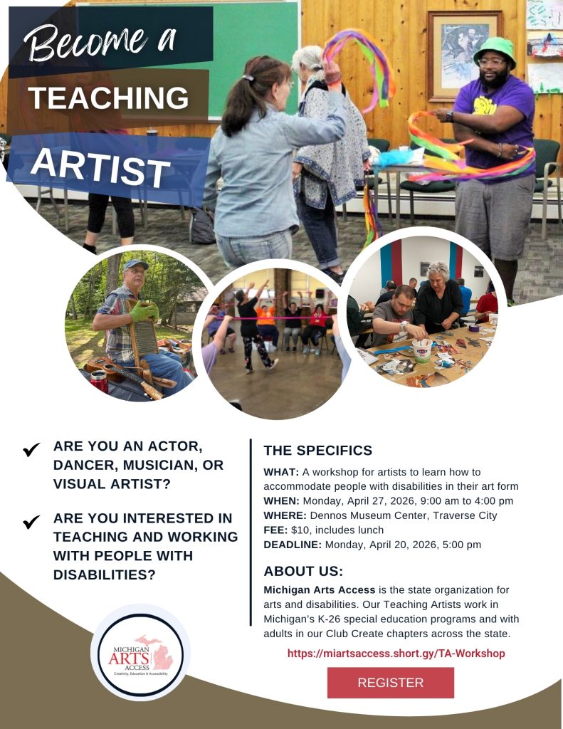 11:00 “Creativity” – The importance of learning in and through the arts for differentiated learners; defining the purpose of the Michigan Arts Access Artists-in-Residence Program. Presenters: George Armstrong, Retired Special Educator, Brandon Shirley, Teacher of the severely multiply impaired, Michael Gielniak, MiAA Executive Director, Lora Frankel, VSA Michigan Director Emerita, and project partners, Troy DeShano, Executive Director of the Northwest Michigan Arts & Culture Network, Kristi Wodek, Vice President of Crooked Tree Arts Center, and Liz Celeste, Curator of Education and Exhibitions at the Dennos Museum Center in the Janis Room